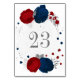 Romántica tarjeta de número de mesa para boda con flores rojas oscuras y azul marino con hojas de plata botánicas.