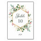 Estos preciosos números de las mesas bodas de vacaciones presentan un marco geométrico de oro falso con hojas de oro a juego, vegetación de Navidades y bayas grises en un fondo blanco crujiente. Perfecto para tu elegante boda de invierno.