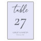 Mejore su recepción nupcial con nuestra elegante Lavanda con números de mesa Boda personalizados en gris. Cada número de tabla presenta un suave fondo de lavanda adornado con sofisticados guiones grises, personalizados con sus nombres y fecha de boda. Estos toques personalizados no sólo guían a los clientes a sentarse, sino que también le dan un toque de elegancia y encanto a la decoración. Perfecto para cualquier tema boda, estos números de tabla combinan diseño atemporal con sofisticación personalizada, convirtiéndolos en un hermoso añadido a su día especial.