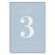 This elegant table card design features a soft, pastel blue background with an understated yet sophisticated aesthetic. The large, ornate number "3" takes center stage, complemented by delicate cursive and clean sans-serif typography that adds a touch of timeless charm. Perfect for a wedding reception, the minimalist style exudes a serene and romantic mood, inviting guests to enjoy a beautifully coordinated event. With its simple yet refined look, this design seamlessly blends into any classic or modern decor theme, ensuring your special day feels both personal and polished.