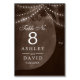 Ilumina tu recepción de boda rústica con estos encantadores números de mesa. El fondo marrón cálido presenta un árbol bellamente ilustrado adornado con luces de cadena brillantes. Las iniciales talladas añaden un toque personalizado, haciendo que cada número de mesa sea un recuerdo único para tu día especial. Perfecto para celebraciones al aire libre o en interiores, estos números de mesa crean una atmósfera cálida y acogedora.