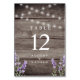 Rústico y elegante con madera marrón oscura falsa con luces de cuerda a lo largo de la parte superior y flores de lavanda en la parte inferior señal de número de mesa de boda.