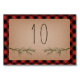 Una carta boda de número de mesa con un ilustracion de ramas de árbol evervescas sobre un fondo inspirado en la yegua roja y negra y el material de cartón.