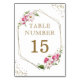Elegante número de mesa con hermosas flores rosas con marco falso hexágono de Relieve metalizado dorado sobre un fondo blanco.