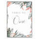 Diseño tipográfico moderno y elegante, tarjeta de número de tabla. La tarjeta presenta un marco acuático elegante de hojas tropicales en tonos rosa coral, verde jungla y sabio plateado. Tonos de coordenadas de texto gris plateado. Al solicitar tarjetas de número de tabla, cada tarjeta debe ser numerada y ordenada individualmente. Diseñado para coincidir con nuestra colección de trópicos modernos.