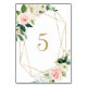 Número de Mesa de Acuarela Geométrica de Floraciones de Primavera | Número de mesa elegante y femenino con ilustraciones de acuarela de rosas y peonías blancas, duraznas y rosadas, acentos de follaje y marco geométrico de lámina falsa. Este número de mesa floral es perfecto para eventos de primavera y jardinería.