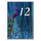 Elegante carta de números de la mesa de la recepción de bodas, con gráficos de un rico fondo de satén azul turquesa, con un florecimiento azul con un pavo real colorido. Personaliza el número blanco de cada mesa en la recepción. Productos a juego disponibles.