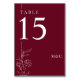 This elegant table number card features modern floral line art on a deep burgundy background. The clean white typography creates a clear and stylish layout that stands out on any reception table. The design offers a refined and coordinated look for weddings with a classic or romantic theme. It pairs well with fall and winter celebrations and completes a matching burgundy wedding stationery suite.