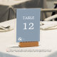 Un número de mesa boda moderno y único que incluye el nombre de la novia y del novio en azul polvoriento. Personalice su propio boda Dusty Blue con este diseño y color en nuestra colección.