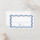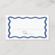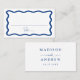 Añada un toque elegante a su recepción de bodas o evento especial con estas modernas tarjetas de boda Wavy Frame. El diseño retro muestra "Table" en un guión azul escrito a mano con espacio para que escriba el nombre y el número de tabla de su invitado. Un borde ondulado azul rodea el diseño contrastando con un fondo blanco. En la parte posterior de la tarjeta de lugar plana aparecen sus nombres y la fecha del boda con letras blancas en negrita.