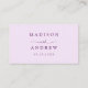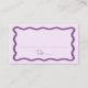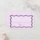 Añada un toque elegante a su recepción de bodas o evento especial con estas modernas tarjetas de boda Wavy Frame. El diseño retro muestra "Table" en un guión morado escrito a mano con espacio para que escriba el nombre y el número de tabla de su invitado. El diseño contrasta con el fondo violeta claro de un borde violeta oscuro. La parte posterior de la tarjeta de plaza plana incluye sus nombres y la fecha del boda en negrita con letras violetas.