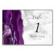 El borde izquierdo de esta elegante y moderna tarjeta boda número de mesa cuenta con un borde de agate color morado con un falso purpurina plateado. El texto del personalizable combina el guión de escritura a mano morado oscuro con el cursiva negro y los tipos de letra de copperplate en un fondo de mármol gris y blanco.