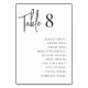 Las tarjetas de número de tabla simples y de moda en blanco y negro clásicos hacen una declaración elegante en su boda o evento. Funciones de diseño "tabla [número]" en la escritura manuscrita, con nombres de invitados individuales debajo en tipografía serif intemporal. El diseño se repite en ambos lados.
