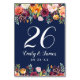 Las tarjetas numéricas bodas de estilo rústico romántico presentan un elegante monograma con números enmarcado por una acuarela floral con hermosos rosas, dahlias, flores de peonía y vegetación, en una espléndida paleta otoñal de rojo burdeos, amarillo dorado, naranja de melocotón, rosa rubor y tonos verdes. Color de fondo azul marino rico.
