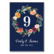 Las tarjetas numéricas bodas de estilo rústico romántico presentan un elegante monograma con números enmarcados por una corona acuática floral con hermosos rosas, dahlias, flores de peonía y vegetación, en una espléndida paleta otoñal de rojo burdeos, amarillo dorado, naranja de melocotón, rosa rubor y tonos verdes. Color de fondo azul marino rico.