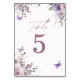 Elegante acuarela floral y número de mesa de diseño de mariposa.