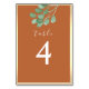 Este número de mesa combina la elegancia rústica con un toque moderno. Los elementos de eucalipto en acuarela en tonos suaves y exuberantes, acentuados con tonos dorados y terracota en naranja quemada, emanan un encanto atemporal. La escritura a mano simple añade un toque de gracia, haciéndolo perfecto para una boda elegante y de inspiración botánica.