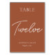 Los números de mesa modernos elevan la decoración de la mesa de la recepción de bodas. El diseño presenta un elegante tipo de letra de guión en blanco sobre un fondo de color tierra naranja quemado perfecto para una boda o un evento de banquete en otoño. Solicite cada número de tabla de la colección o edite esta tarjeta por cada número necesario. El diseño está impreso en ambos lados.