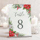 Bonitas mesas con ilustraciones de acuarela botánica pintados a mano de flores de poinsettia, vegetación de invierno, ramas de pino y abeto y bayas huecas.