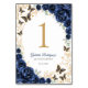 Navy gold Quinceanera celebration table number cards. Features, script font, gold butterflies, watercolor roses and tiara. Perfect for an elegant princess style glam celebration. Personalize with your own details. Printed Zazzle invitations or instant download digital printable template.