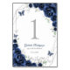 Navy silver and white Quinceanera celebration table number cards. Features, script font, silver butterflies, watercolor roses and tiara. Perfect for an elegant princess style glam celebration. Personalize with your own details. Printed Zazzle invitations or instant download digital printable template.