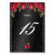 Elegante fondo negro con rosas rojas y acentos dorados números de mesa de Quinceañera. Personaliza fácilmente la información de estos números de tabla de membrillo y tienes tus propios números de tabla de personalizado para que coincidan con tu tema de quinceañera! Por favor vea nuestra colección de Quinceañera Black with Red Roses para felicitar y hacer coincidir la decoración de sus años de fiesta de membrillo. Numerosos Para Mesas negro con rosas rojas para quinceaños.
