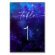 Bring a clean, organized look to your reception tables with this elegant table number card, featuring a dramatic starfield galaxy background in deep indigo and violet tones with modern script typography. Designed to help guests find their seats quickly, this table number adds a polished detail to your reception tablescape. Perfect for night sky, galaxy, cosmic, and space inspired weddings. This design can be customized for any table number to create a cohesive set for your reception. Display in frames or holders, or place directly on the table for a romantic, minimalist look.