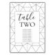 Este diseño presenta un elegante diseño geométrico en blanco y negro. El fondo del patrón geométrico crea el fondo perfecto para los detalles del boda. La combinación de los colores blanco y negro crea un estilo sofisticado, moderno y de moda. Elegante diseño de tarjetas de números de mesa de boda con elementos modernos. La decoración moderna de la tipografía le da un estilo distinto. También hay disponibles invitaciones de boda coincidentes y otros artículos de papelería.