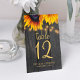 Un elegante número de mesa de bodas rústico con texto editable con grandes girasoles y un guión de oro de moda sobre un fondo de madera marrón oscura con luces de cuerda. Ideal para su verano o otoño en el jardín al aire libre o boda de una casa de campo.