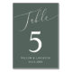 Número mínimo y elegante de la tabla de bodas con un texto de escritura moderno que dice "Tabla" en la parte superior de un fondo verde del bosque.