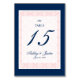 Tarjeta de número de tabla Boda tradicional rosa y azul marino con elegante letra de guión. BlissfulWedding © en Zazzle. Personaliza con nombres de novias y novios y fecha de boda.