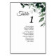 Este signo de números de mesa neutros del boda botánico con los huéspedes proporciona un sencillo paladar rústico de plantas para coordinar con cualquier tema tradicional de la recepción de bodas. La vegetación mínima, con tonos oscuros y grises de elegantes hojas de eucalipto verde y follaje vegetal, junto con la caligrafía informal elegante, abren un ambiente minimalista a una celebración matrimonial clásica y formal.