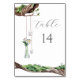 Estos hermosos números de mesa de Sweet Garden son la adición perfecta a cualquier boda elegante. Ramas de árbol con velas colgadas y un jarrón lleno de flores.