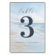 Esta tarjeta de mesa de boda presenta una escena de playa serena con olas suaves y un cielo azul suave, creando una atmósfera tranquila e invitante. El diseño muestra un gran numeral "3" en azul marino negrita, complementado con tipografía cursiva elegante para la palabra "mesa", mientras que los espacios personalizables permiten la personalización con nombres y fechas. El estilo minimalista enfatiza líneas limpias y espacio abierto, mejorado por un efecto de acuarela que agrega una cualidad soñadora al fondo junto al mar. Perfecta para agregar un toque de sofisticación a su ocasión especial, esta tarjeta captura la esencia de la relajación y la celebración.