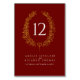 Elegante hoja de corona ovalada en oro efecto sobre rojo oscuro con número de tabla boda de texto blanco. Edite esta tarjeta con sus propios nombres, detalles del boda y número de tabla. Debe cambiar el número a cada número de tabla que necesite y agregarlo a su carrito, uno a la vez. Los descuentos por cantidad se pueden aplicar una vez que añadas todos los artículos a tu carrito. Hay otros elementos coincidentes disponibles. Diseñado por www.mylittleedenweddings.com
