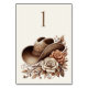 Guíe a sus huéspedes con estilo con estos elegantes números de mesa, diseñados para complementar su moderna temática de boda de Country Western. Presentan flores neutras y un encantador y lujoso motivo gorra de vaquera, y combinan el encanto rústico con la elegancia atemporal.