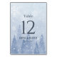 Esta carta con el número de la mesa tiene una romántica escena de invierno azul polvoriento de pinos que se desvanecen y copos de nieve blancos. También están disponibles el menú, las servilletas y los pegatinas. Forma parte de una suite boda completa. Puede hacer clic en la opción personalizar para seleccionar todos los números de tabla que necesitará.