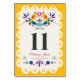 This Papel Picado Yellow Nuestra Boda Spanish Wedding Table Number frame is adorned with a cutout pattern resembling a papel picado effect, adding a traditional Mexican touch. Accented with floral and geometric details in vibrant colors, the design exudes warmth and charm, making it perfect for a romantic wedding stationery.