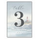 This wedding table card features a serene coastal scene with a prominent lighthouse illustration, set against a soft pastel background of light blue and white hues. The design includes a large numeral "3" in bold, dark gray, complemented by elegant cursive typography for the word "table." The watercolor art technique gives it a dreamy, ethereal quality, while the realistic depiction of the lighthouse adds charm. Customizable placeholders allow for personalization with names and dates, making this an ideal choice for creating a romantic and peaceful ambiance at your special event.
