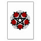 Pentagrama negro con estampado, decorado con rosas rojas florecientes con hojas sobre fondo blanco. Estilo tatuaje.