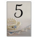 Personalizar estos elegantes números de la mesa de los Bodas Perlas, Anillo y Azul de encaje y crea una tarjeta diferente para cada mesa en su elegante fiesta de compromiso de perlas o de tintes azules y blancos, ducha de novia o recepción matrimonial. Estas elegantes tarjetas personalizados de números de tabla muestran una fotografía de un anillo de compromiso de diamantes, collar de perlas blancas y pañuelo vintage de lino azul y blanco recortado con fondo de satén blanco.