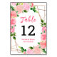 This fun and whimsical table number sign features watercolor pink roses and foliage on a gold geometric frame. The text combines handwritten script and serif fonts for a stylish and modern look. This is perfect for a spring or summer rustic wedding.