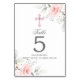 Sencillamente elegante diseño de ramo rústico florido en acuarela (acuarela) verde pastel, rosa rubor, rosa, rosas de flores blancas / flores de cerezo sobre fondo blanco y letras grises oscuras. Cruz rosa con diamantes falsos. Delicados números de la primera mesa de la Santa Comunión para el chica.