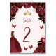 Estas preciosas tarjetas de mesa de la quinceañera cuentan con un borde de flores de color burdeos sobre un fondo de color burdeos pálido. Una tiara dorada, un chica de pelo oscuro con un vestido de princesa borgoñona y pequeñas mariposas borgoñonas decoran el texto. La palabra "tabla" y el número aparecen en escritura a mano en burdeos.