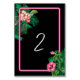 Una moderna pero retro temática neón rosado botánico sobre fondo negro. Un bonito diseño boda ideal para el verano. Diseño perfecto de plantas tropicales de neón rosa con palmeras, flores rosadas de Hibiscus y flores Plumerias Frangipanis. Los colores negro, rosa y verde dominan este diseño de neón rosa tropical. La moderna tipografía caligráfica contrasta perfectamente con el diseño de temática boda negro y rosa. Un elegante diseño de tarjetas de números de mesa de boda con elementos modernos y sencillos. También están disponibles artículos de papelería para bodas y otros formatos de invitación para bodas. Personalizar el número y compra cada número de tabla individualmente según cuántos números de tabla necesite.