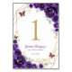 Purple gold and white Quinceanera celebration table number cards. Features, script font, gold butterflies, watercolor roses and tiara. Perfect for an elegant princess style glam celebration. Personalize with your own details. Printed Zazzle invitations or instant download digital printable template.