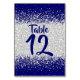 Esta moderna tarjeta numérica tiene un efecto purpurina plateado sobre un fondo azul real profundo. Puede cambiar el estilo y el color del tipo de letra y, además, agregar cada número de tabla individualmente, yendo al menú personalizar. Forma parte de una suite boda con un menú a juego, tarjetas de plaza y otros elementos esenciales.