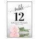 Estas hermosas tarjetas numerales facilitarán a los clientes la posibilidad de encontrar sus asientos en la recepción de su boda. Presenta un diseño magnífico con caligrafía de escritura de encaje y una rosa rosa rosa rosa de color rosa sobre su lado con ondas de ondas y reflejos. Hay espacio para los nombres de la pareja y la fecha de boda.