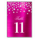 Elegante número de tablas de bodas con una sofisticada caligrafía de escritura emparejada con un tipo de letra moderno. La imagen gráfica de fondo muestra falsos tonos rosados, fucsia, Relieve metalizado negro satinado magenta y diamantes de confeti diamante de imitación blanco plateado en la parte superior. Cualquier brillo o brillo es una creación digital. El texto del número de tabla se duplica al principio y al final, pero puede personalizar a un lado si prefiere una lista de nombres de invitados.