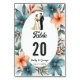Este elegante número de mesa de boda floral acuático es perfecto para un boda moderno. El diseño romántico presenta un elegante marco floral acuático con un ilustracion de novia y novio y una caligrafía negra sobre un fondo blanco.